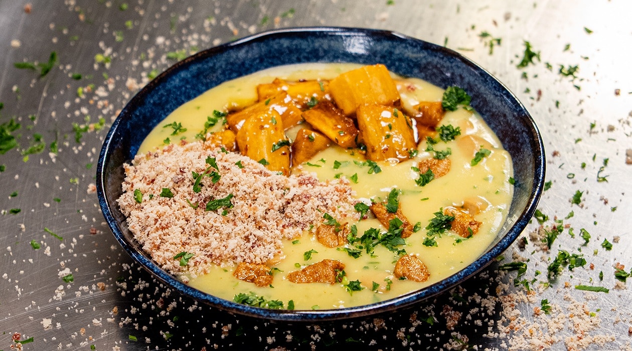 Arroz tostado com sobrecoxa assada glaciada – comida de rua moderna
