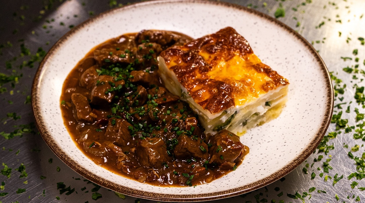 Carbonnade na Cerveja Escura com Gratinado de Batata & Abobrinha