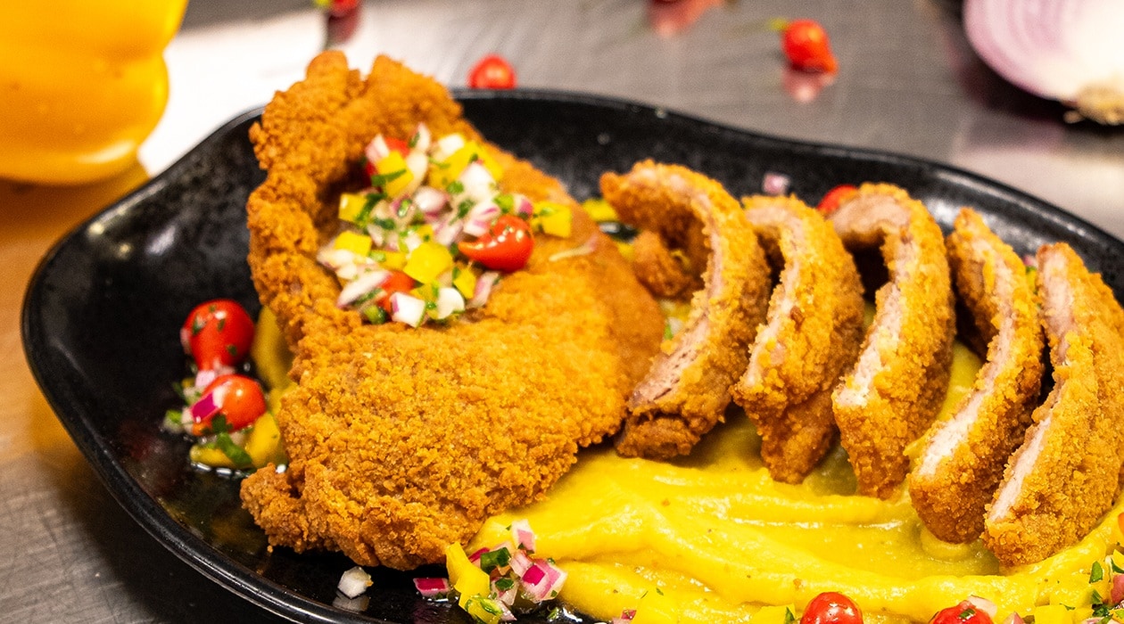 culinária brasileira moderna, milanesa crocante, purê tropical, prato regional, comfort food brasileiro