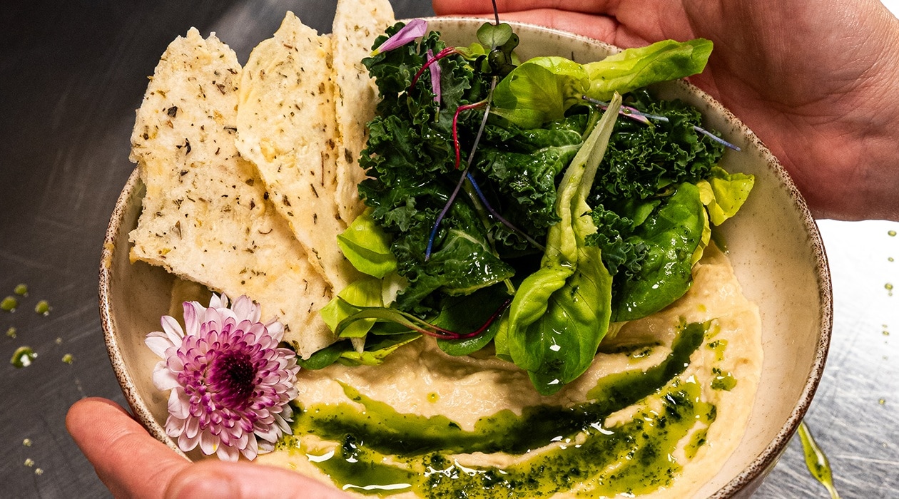 Salada Fresca com Homus, Pesto de Couve & Crocante de Tapioca